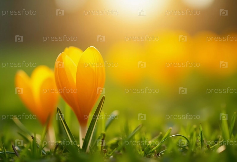 Нежные желтые цветы крокуса расцветают в пышной зеленой траве, солнечный свет в тихой весенней обстановке Возрождение природы Шафран Крокус - род многолетних луковичных травных растений семейства Iris Iridaceae