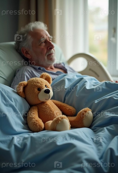 Пожилой мужчина смотрит из больничной кровати на своего товарища плюшевого медведя, отдыхающего в мягких синих одеялах.Вместе они олицетворяют надежду, стойкость и утешение общения во времена трудностей