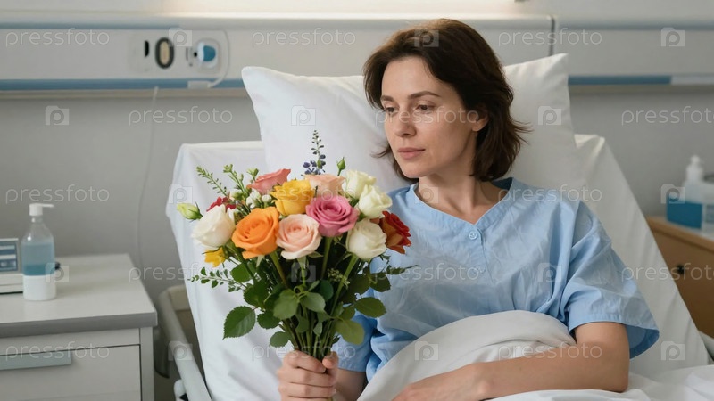 Женщина сидит на больничной койке, держа в руках букет красочных цветов. Она выглядит обдуманно, когда она выздоравливает от болезни в палате. Это время исцеления и поддержки Генеративный ИИ