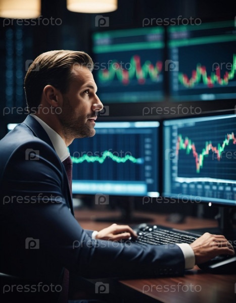 Трейдер, ориентированный на цифровой финансовый анализ сидит за компьютером в элегантном торговом зале, заполненном экранами, отображающими рыночные тенденции и данные