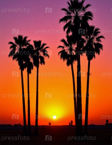 Когда солнце опускается ниже горизонта, небо извергается в яркие оттенки апельсина и фиолетового цвета, а пальмы стоят высоко, рисуя живописный вечер