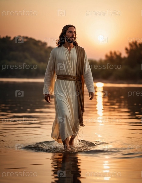 Иисус Христос. спокойная фигура ходит по тихим водам на закате, создавая волны в отражающем озере. теплый золотой свет купает сцену, духовную атмосферу спокойного момента. созданный ИИ
