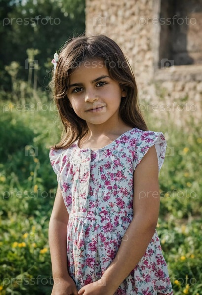 Молодая девушка с длинными коричневыми волосами мягко улыбается, одета в цветочный наряд.Окружена яркой зеленой и дикими цветами, она олицетворяет невинность и радость в спокойном пейзаже Generative AI