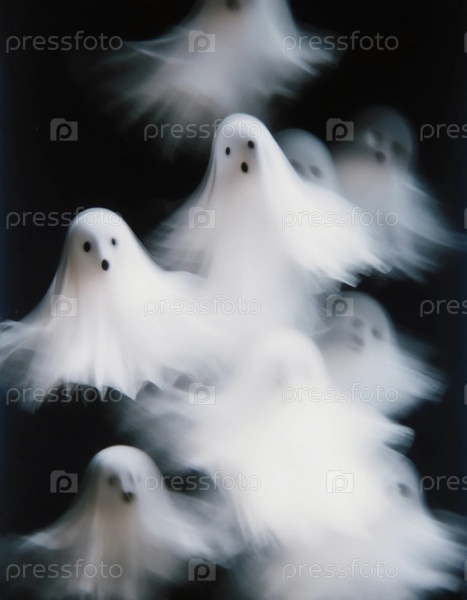 Плавучие призраки появляются в различных позициях на темном фоне, создавая устрашающую сцену, заполненную движением и тайной ночью