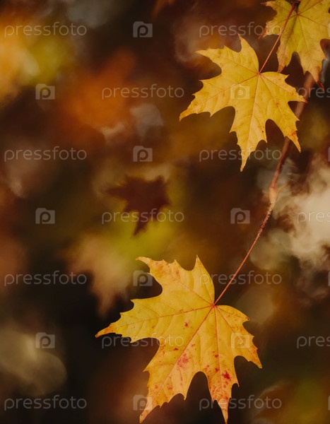 Осенние кленовые листья демонстрируют яркие цвета на размытом фоне, захватывая красоту осеннего сезона в спокойной обстановке
