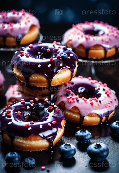 Соблазнительная куча свежеприготовленных голубиных филевых пончиков с богатой глазурью, демонстрирующих яркие ягоды сверху, идеально подходит для желания десерта в любое время суток