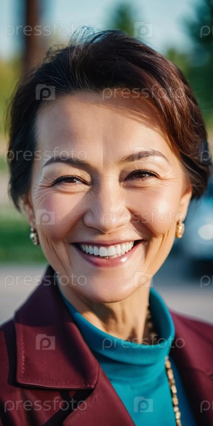 Веселая 50-летняя женщина наслаждается солнечным днем в парке, демонстрируя свою сияющую улыбку и элегантные жемчужные серьги, когда она обнимает момент