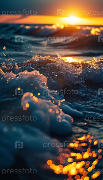 Горизонт светит яркими оранжевыми и красными цветами, поскольку волны мягко врезаются в берег, отражая теплые цвета заходящего солнца на спокойной поверхности океана