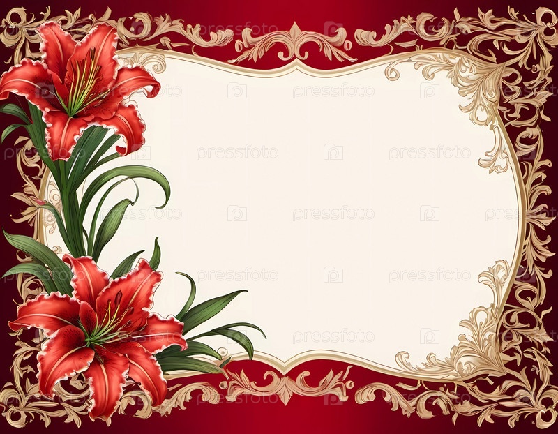 Красиво оформленный цветочный дизайн отличается яркими красными лилиями на темно-красном фоне. украшенная золотая оборона добавляет оттенок элегантности, идеально подходит для приглашений или декораций