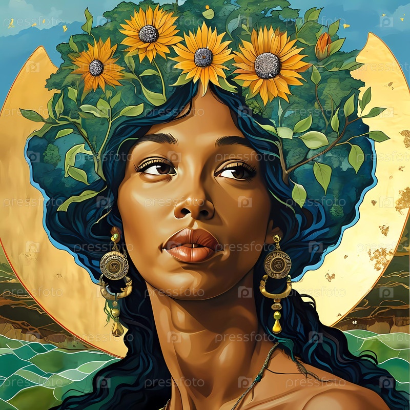 Гайя стоит изящно, ее волосы переплетены с пышными подсолнечками и зеленой растительностью, символизирующей щедрость природы Generative AI