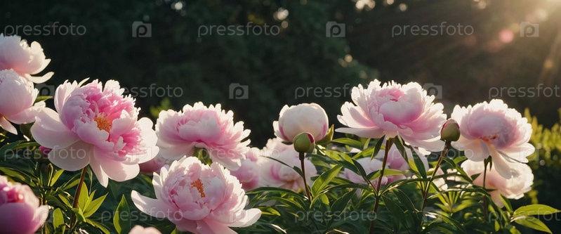 Живые цветы пионки в розовых оттенках стоят высоко, когда на заднем плане заходит золотое солнце, создавая спокойный и атмосферный пейзаж, наполненный теплом