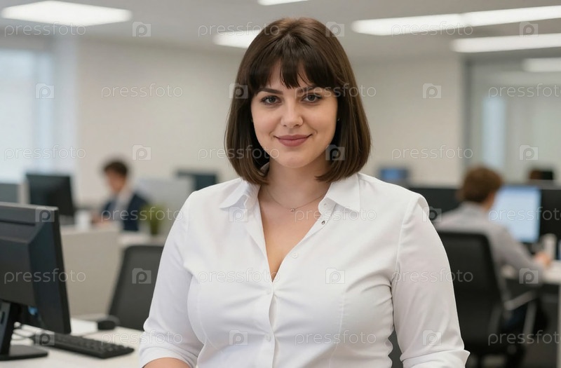 Женщина с коричневыми волосами носит белую рубашку, когда она стоит в офисе банка. Коллеги работают за столами на заднем плане. Это день и офис занят Генеративный ИИ