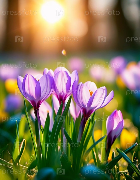 Нежные розовые цветы крокуса расцветают в пышной зеленой траве, солнечный свет в тихой весенней обстановке. Возрождение природы. Шафран Крокус - род многолетних луковичных травных растений семейства Ирис Iridaceae