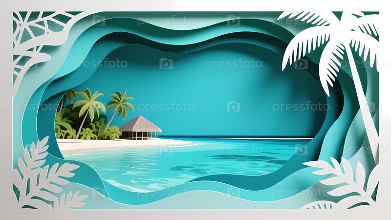 Пляж с волнами и пальмой. на заднем плане - бумажный дизайн, который выделяет океан и уютную хижину. идеально подходит для праздничных приветствий Generative AI