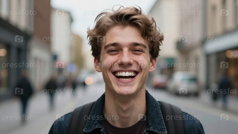 Молодой человек стоит на оживленной улице. Он широко улыбается и показывает белые зубы. Это яркий день, и люди ходят за ним. Его радость ясна, поскольку он наслаждается моментом генеративного ИИ