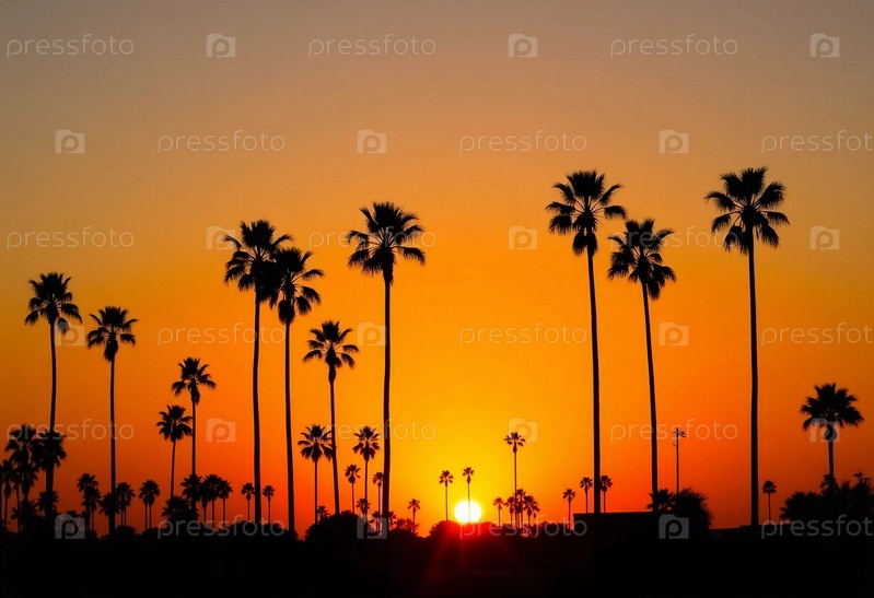 Золотые лучи заходящего солнца фильтруют силуэт пальмовых деревьев, рисуя небо богатым апельсином и глубокими фиолетовыми цветами, вводя спокойные тропические сумерки Generative AI