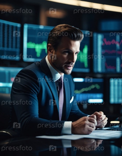Трейдер, ориентированный на цифровой финансовый анализ сидит за компьютером в элегантном торговом зале, заполненном экранами, отображающими рыночные тенденции и данные