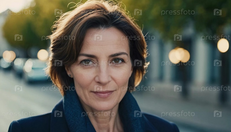 Кавказская брюнетка француженка 50 - 60 лет со средней длиной волос до плеч стоит на причудливой французской улице. пейзаж воплощает спокойную и радостную атмосферу. генеративный ИИ