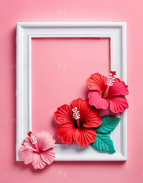 Нежные цветы гибискуса в оттенках красного и розового цвета украшают яркую белую раму на мягком розовом фоне, создавая очаровательную фокусную точку и вдохновляя воображение