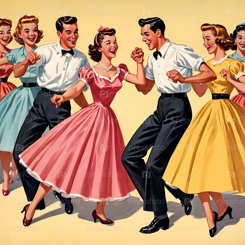 Живая группа подростков, одетых в яркую одежду, танцует вместе с радостью, наполненная смехом и энергией, что напоминает классические танцевальные вечеринки прошлого