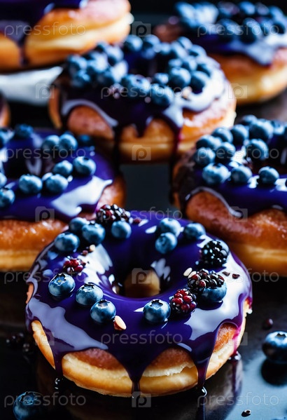 Соблазнительная куча свежеприготовленных голубиных филевых пончиков с богатой глазурью, демонстрирующих яркие ягоды сверху, идеально подходит для желания десерта в любое время суток