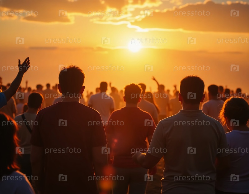 Люди собираются в спокойном месте, поднимая руки в молитве, когда заходит солнце и излучает теплое сияние над пейзажем.Атмосфера наполнена единством и благоговением