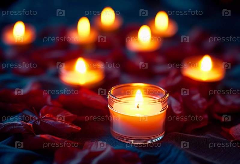 Мягкий свет от мерцающих свечей освещает спокойную сцену, рассеянную лепестками, приглашая к успокаивающей атмосфере, идеально подходящей для моментов размышления и безмятежности