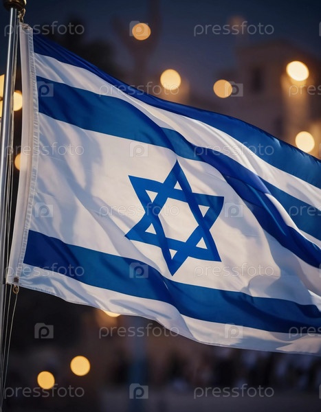 Израильский флаг, размахивающий на ветре с синими и белыми полосами и звездой Давида в центре. ощущение движения и энергии. созданный ИИ