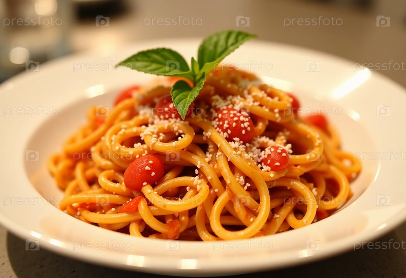Сочные пряди макаронного спагетти вращаются вокруг сочных томатов-вишен, увенчанных свежими листьями базилика и немного сыра, соблазняя каждого посетителя в обеденное время Generative AI