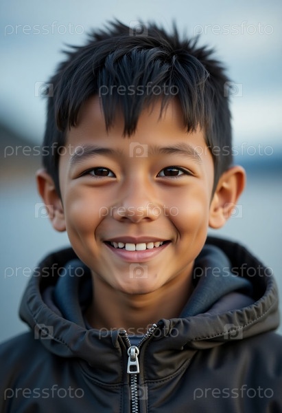 Веселый мальчик коренного населения Аляски ярко улыбается на спокойном фоне природы, его выражение отражает счастье и глубокую связь со своим наследием