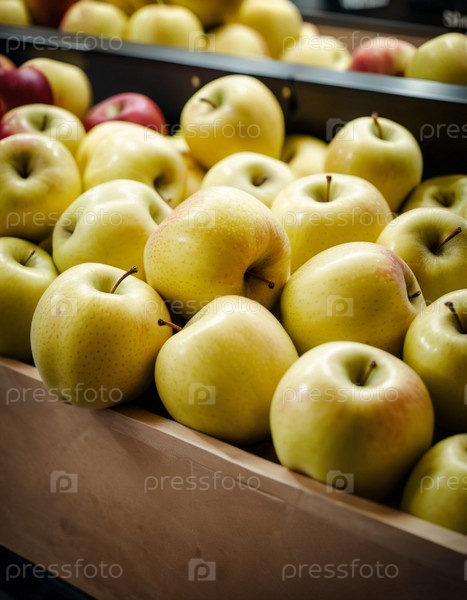 Красочный ассортимент желтых яблок аккуратно расположен на стойке супермаркета, приглашая клиентов исследовать и выбирать свежие фрукты
