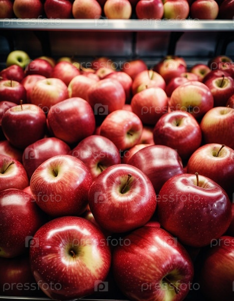 Красочный ассортимент красных яблок аккуратно расположен на прилавке супермаркета, приглашая клиентов исследовать и выбрать свежие фрукты