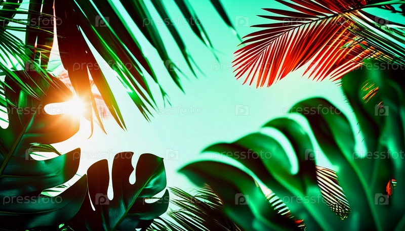 Вид на различные тропические растения с ярко-зелеными листьями, установленные на фоне копировального пространства, создавая живую атмосферу, заполненную естественным светом. Копировать пространство для текста. генеративный ИИ
