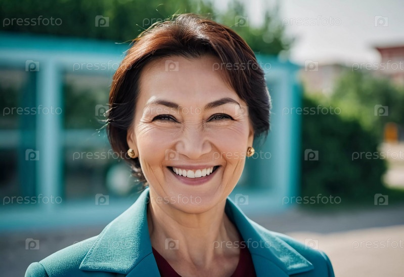 Веселая 50-летняя женщина наслаждается солнечным днем в парке, демонстрируя свою сияющую улыбку и элегантные жемчужные серьги, когда она обнимает момент