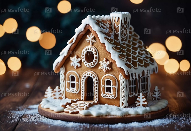 На тарелке выделяется праздничный дом из пряников, украшенный мороженым, конфетами и снежными декорациями.Он отражает дух рождественской выпечки, окруженной веселой атмосферой.Генеративный ИИ