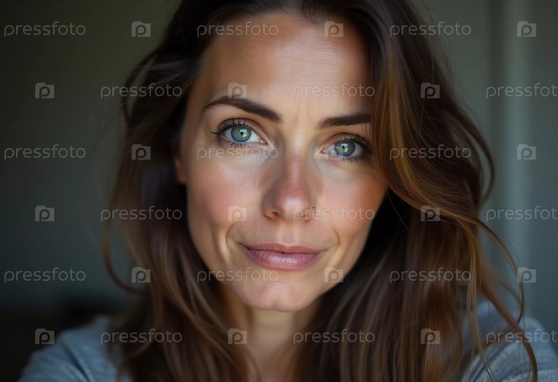 Русская женщина изящно стоит с длинными, распухшими волосами и яркими серыми глазами. Мягкий свет улучшает ее естественную красоту, создавая интимную атмосферу. Серьезная женщина 40-50 лет. Генеративный ИИ