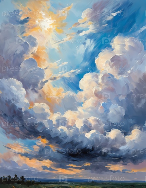 Вибрирующие цвета разворачиваются, когда драматические облака вращаются над горизонтом, создавая захватывающий дисплей на фоне мягкого заката неба.Взаимодействие света и тени очаровывает генеративный ИИ