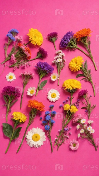 Ярко окрашенные астеры, гербера и хризантемы художественно расположены на живой розовой поверхности, отмечая красоту весенних цветков и поднимая духов
