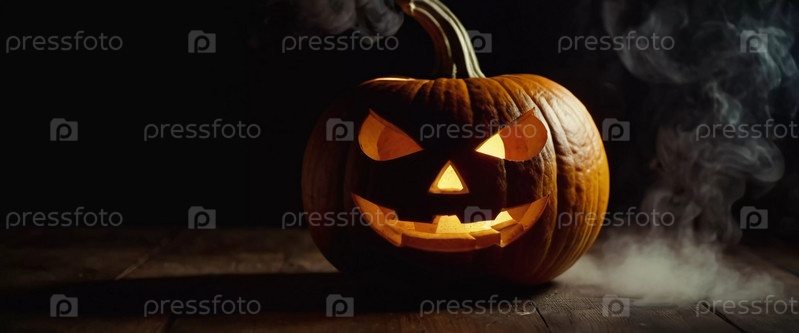 Вырезанная тыква на Хэллоуин имеет угрожающее лицо, освещенное изнутри, а дым извивается вверх, улучшая причудливую атмосферу вечера
