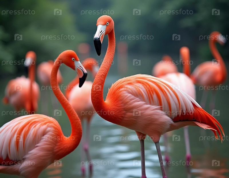 Фламинго собираются в тихом пруду, их оранжевые перья отражаются на воде. Они играют друг с другом и создают потрясающий вид природы. Flamingo Phoenicopterus - род птиц