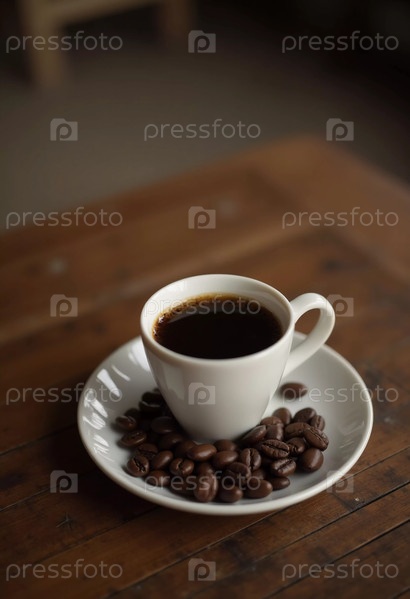 Чашка с эспрессо опирается на деревянный стол, окруженный богатыми кофейными зернами, что вызывает теплую и гостеприимную обстановку, идеально подходящую для наслаждения тихим моментом