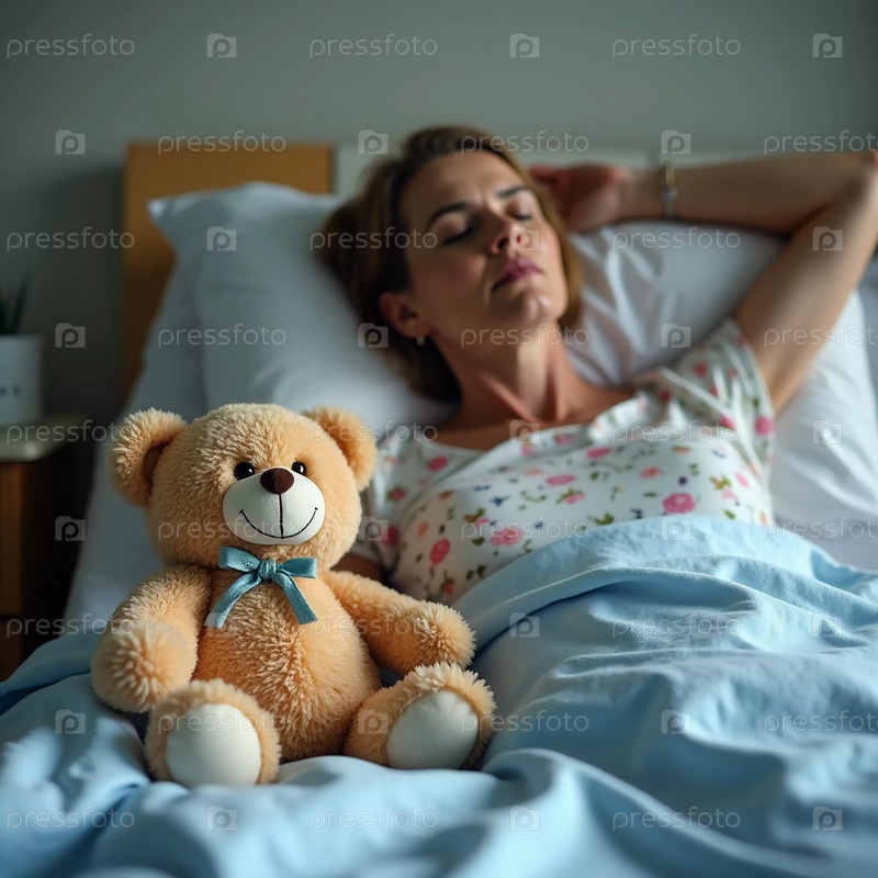 Женщина отдыхает на больничной койке, окружена мягкими одеялами, в то время как ее плюшевый медведь предлагает утешение