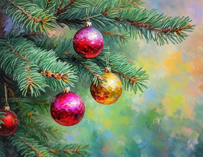 Красочные рождественские украшения украшают ветви пихты, яркие шары в оттенках красного, золотого и розового цветов, воплощающие праздничное настроение зимой