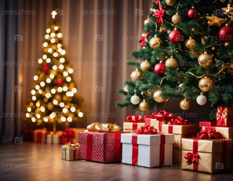 Упакованные в различные цвета подарки сидят под украшенной пихтой, украшенной блестящими рождественскими орнаментами, создавая веселую и праздничную атмосферу для новогоднего торжества