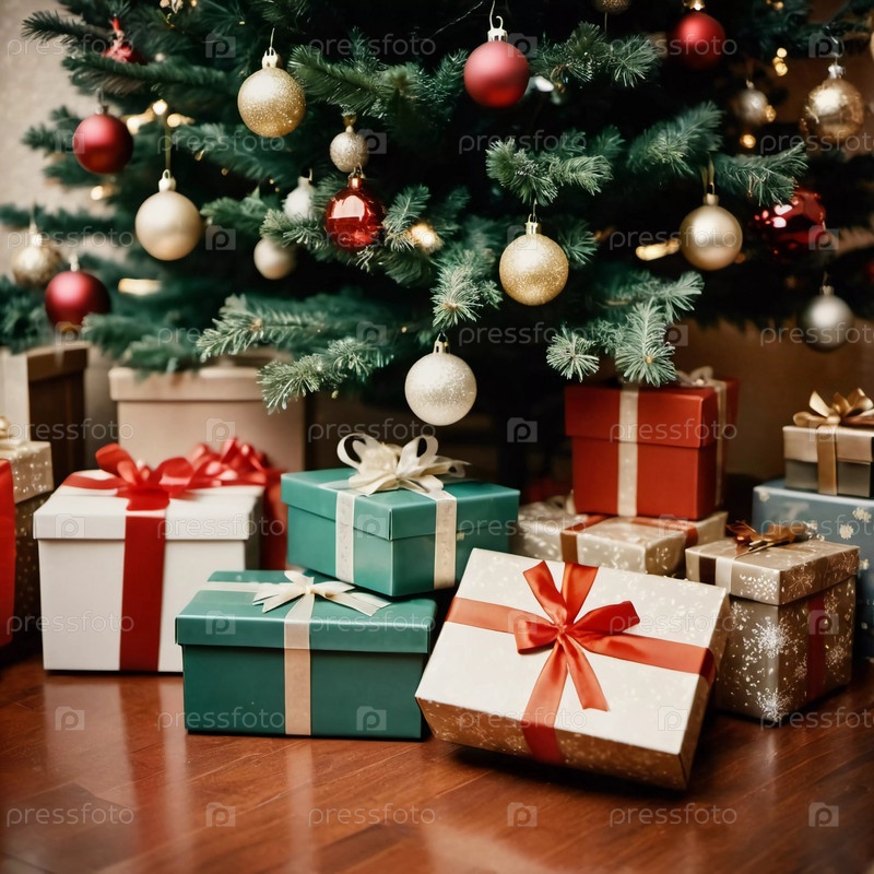 Празднично упакованные подарки в окружении красочных рождественских шаров под красиво украшенной пихтой во время радостного новогоднего сезона