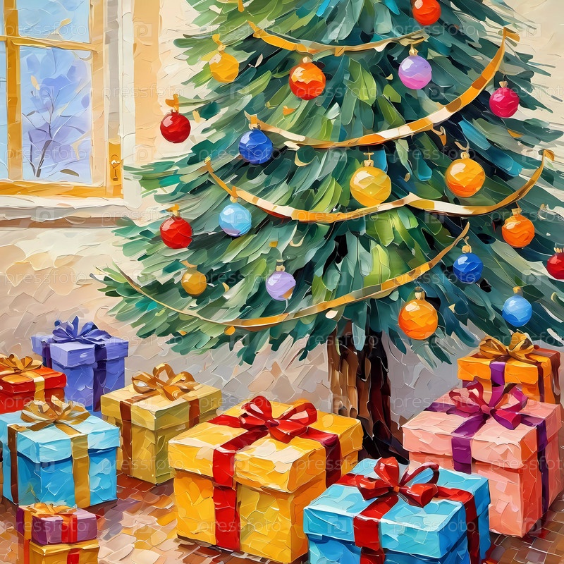 Декорированная рождественская елка, украшенная красочными орнаментами и наложенными подарками готова к празднованию в уютной праздничной обстановке. упакованные подарки различных цветов. праздничная атмосфера, теплота и радость. AI
