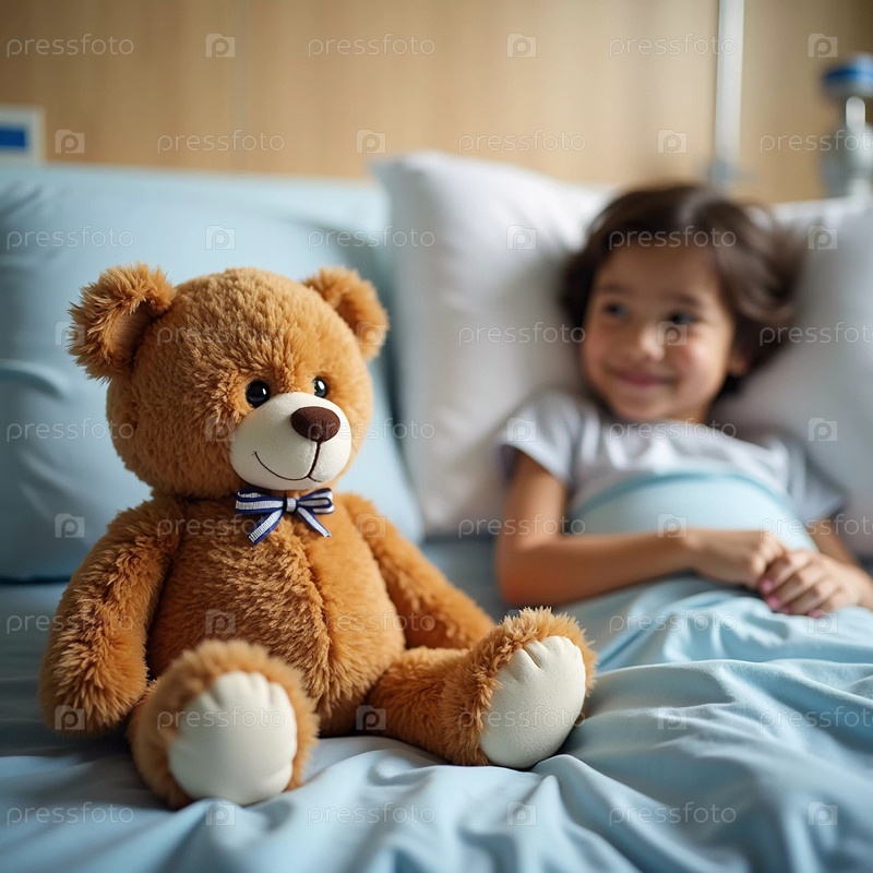 Маленький ребенок отдыхает на больничной койке, улыбаясь большому мягкому плюшевому медведику рядом с ними