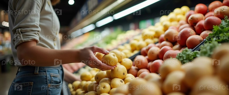 Женщина тщательно осматривает картофель, окруженная множеством ярких овощей и фруктов в оживленном супермаркете