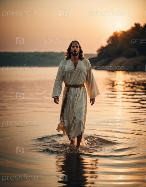 Иисус Христос. спокойная фигура ходит по тихим водам на закате, создавая волны в отражающем озере. теплый золотой свет купает сцену, духовную атмосферу спокойного момента. созданный ИИ