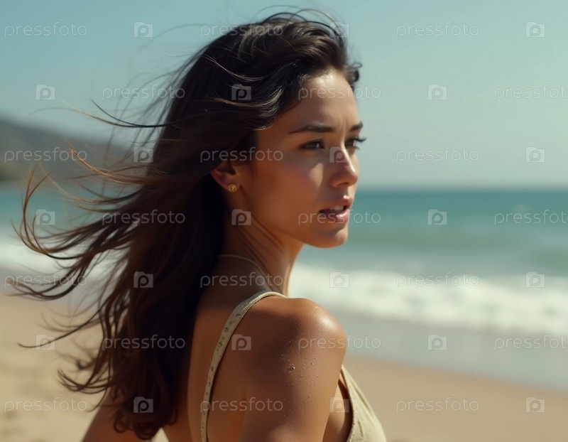 Брюнетка в купальнике смотрит назад, стоя возле береговой линии. Нежные морские волны обнимают ее у ног под чистым голубым небом. Длинные волосы, красивое молодое лицо. Путешествия и реклама одежды
